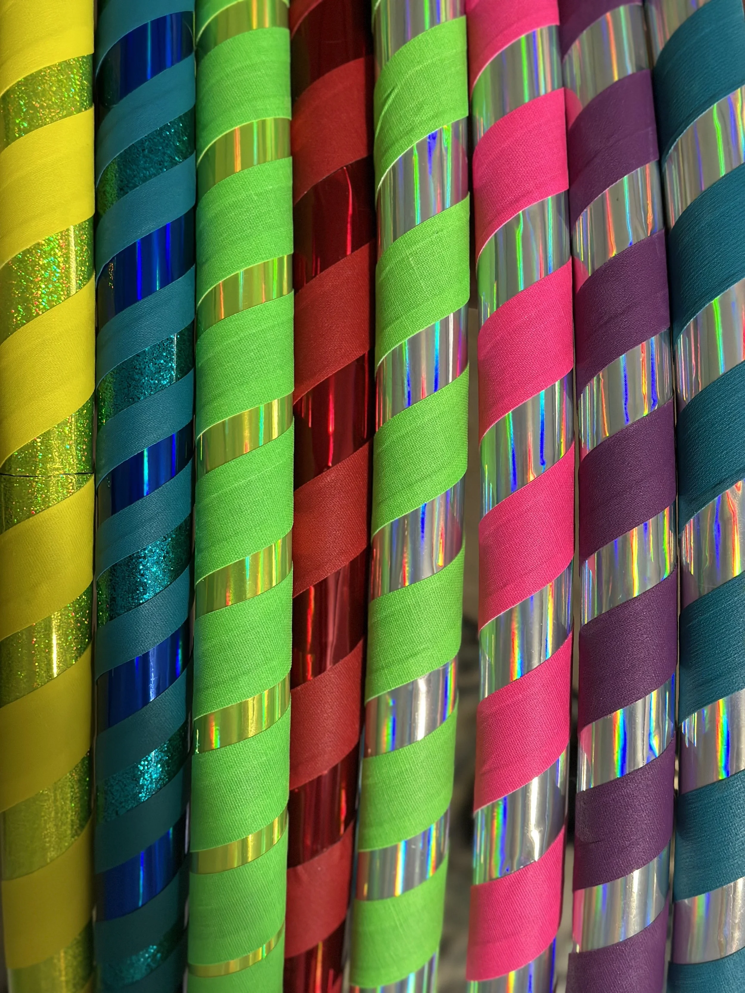 Larger hoops (40”+) are ideal for beginners or practitioners who want a slower deliberate pace for core workouts and learning on-body tricks. These hoops are wrapped with at least one layer of gaffer tape to give the hoop grip and prevent sliding. Large hoops can be made to collapse for easy travel and storage.