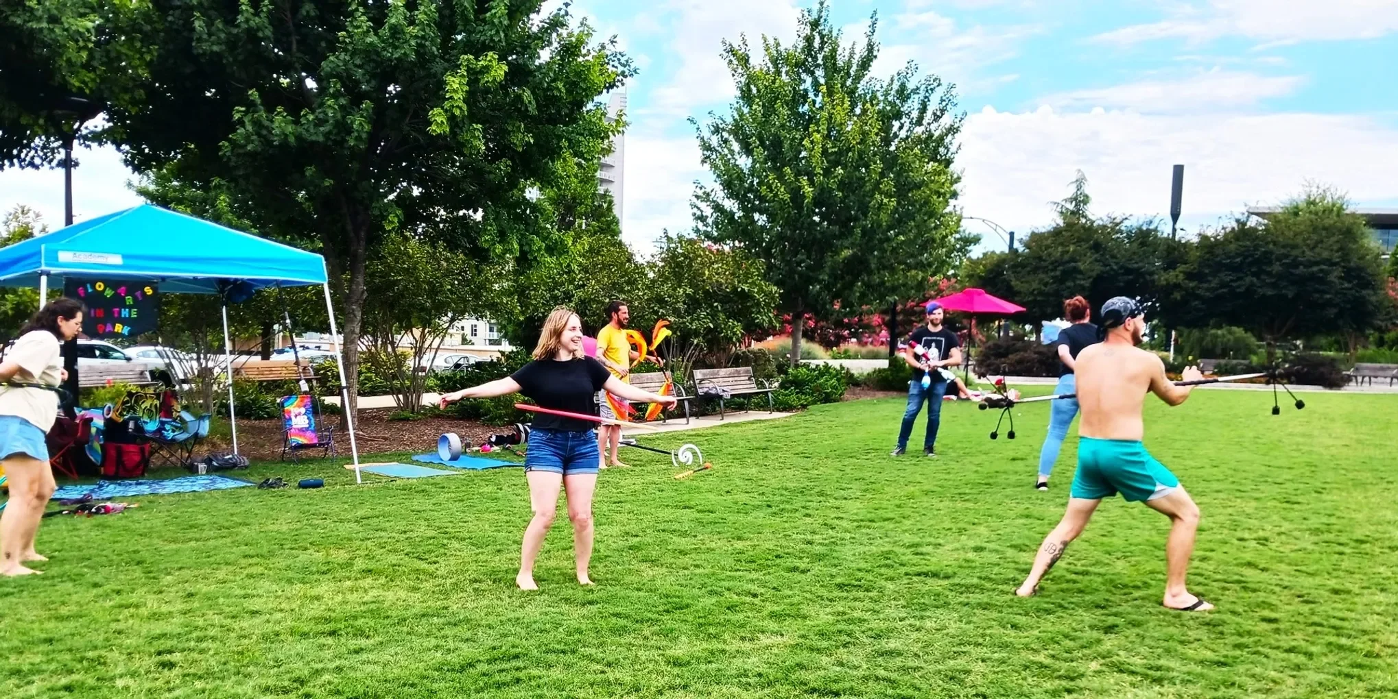 Charlotte Flow Arts in the Park is a free, family-friendly monthly meet-up and flow arts skill share. Founded in May 2022 by flow artist and fire performer Wesley Stephens, it picks a different park or event to meet each month in the Charlotte, NC and surrounding areas. It aims to make flow arts accessible while connecting and growing the flow arts community. See their website for upcoming dates and park meet ups!